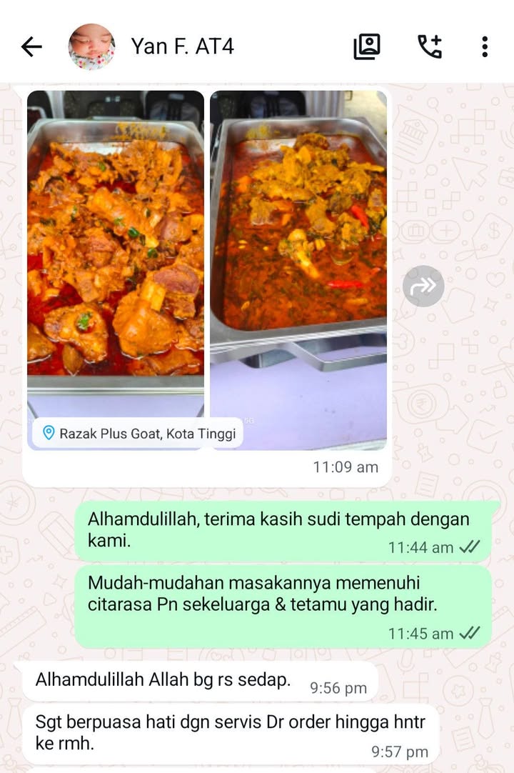 Tempahan: Majlis Akikah & Open House Raya Lokasi: Felda Air Tawar 4, Kota Tinggi Pakej kambing golek: 1 ekor kambing akikah Termasuk side dish - Black pepper sauce - Mushroom soup - Kentang gore... Read More